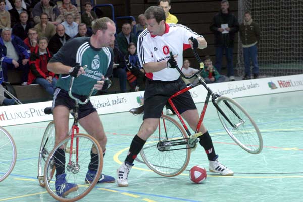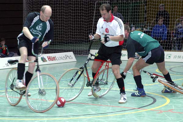 Die Zuschauer waren sehr schnell begeistert, denn die Heimmannschaft (Lange/Brede) lag überraschend gegen die ehemaligen Weltmeister aus Hameln (Hormann/Latzel) sehr früh mit 3:0 in Front. Die Gäste wurden zusehens nervöser und konnten nur ein Tor im ersten Abschnitt erzielen. Die zweite Hälfte bot weiterhin attraktiven Radball, bei dem aber sich die bessere Erfahrung letztendlich durchsetzte. ![]() ![]() ![]() ![]() ![]() ![]() ![]() ![]() |
