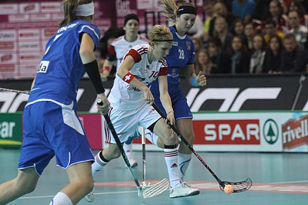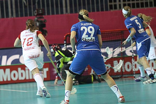 Nach dem spannenden Spiel um Platz 5 war die nahezu eintönige Meinung im Presseraum der vermeidlichen Experten: viel Attraktivität konnte man von den beiden folgenden Spielen nicht erwarten. Zu dominant hatte Schweden bis dato gespielt, als das man Finnland auch nur eine Chance zumutete und auch auch für das Spiel um Platz 3 sah man die Schweiz als den haushohen Favoriten gegen Tschechien. Als Julia Suter nach fünf Minuten in Führung brachte, war die MS Coray also voll auf Kurs, doch danach - um in der Seefahrer-Sprache zu bleiben - begab man sich immer mehr selber in schwierige Fahrwasser. Die Schweizer waren zwar bis etwa zur 25. Minute deutlich feldüberlegen, machten daraus aber viel zu wenig und enttäuschten die grossartige Kulisse. Dann kam Tschechien immer mehr auf, Heidi Jud konnte einen Schuss in der 29. Minute mit der Maske noch gerade so an den Pfosten klären - umso wervoller war es da, dass Corin Rüttimann in der 31. Minute vom rechten Flügel auf 2:0 erhöhte. Nach dem Spielverlauf war dies aber immer noch eine magere Führung - doch es kam noch schlimmer: Ramona Gabathuler holte sich eine dumme Zeitstrafe nach einem Abstandsvergehen ab und Iveta Hyrslova mümmelte den Ball in der 35. Minute in Überzahl über die Linie. Als zwei Minuten später Hanka Lackova einen erneuten "Rebound" verwertete, war das Spiel auf den Kopf gestellt. Das gab natürlich tschechisches Selbstvertrauen, während die Schweiz immer mehr ideen- und systemlos schien. In der 52. Minute sorgte dann Dominika Steglova für den Todesstoss und brachte ihre Tschechinnen erstmals in Führung. Mehr als Kampfgeist konnte man den Schweizerinnen, die auch munter ihre Reihen wechselten, dabei leider nicht unterstellen. Auch dass Figi Coray erst 47 Sekunden vor Spielende dazu kam, Heidi Jud gegen eine sechste Feldspielerin zu tauschen, war geradezu symptomatisch. Gefahr für Jana Christianova, die mit ihrer starken Leistung an die schweizer Finalplayoffs der Vorsaison erinnerte, wurde in der Schlussphase immer weniger, so dass letztlich Tschechien absolut verdient die Bronzemedaille gewann, während die Schweiz im eigenen Land in das sportliche Tal der Tränen gestürzt wurde.